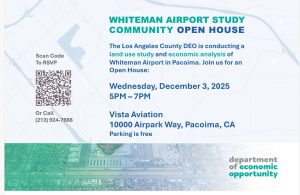 The Los Angeles County Department of Economic Opportunity is conducting a land use study and economic analysis of Whiteman Airport in Pacoima. This study will evaluate the land use options for Whiteman Airport, which includes keeping the airport open, closing the airport in full, or in part, as well as outlining the airport closure process that would be required by the Federal Aviation Administration (FAA).