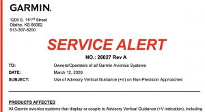 03/17/2026 Garmin Alert Cautions Pilots about Descent Below MDA - From AIN - "Advisory glide paths do not provide obstacle or terrain clearance assurance - Garmin issued a service alert on Thursday that reminds pilots to follow instrument approach procedure minimum descent altitude (MDA) limits when flying an approach with advisory vertical guidance. These approaches are identified by a “+V” indication on primary flight displays. - While the alert doesn’t mention the February 13 crash of an Epic E1000 on approach to Colorado’s Steamboat Springs Airport (KSBS), this accident raised questions about the importance of not following the advisory glide path below the MDA unless..." Read More Here.