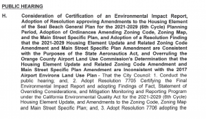 Those documents were the Housing Element (which still hasn’t been certified by the state government), the citywide ZoninThe Orange County Airport Land Use Commission recently determined that several city documents were inconsistent with the JFTB Airport Environs Land Use Plan.g Code Amendment, and the Main Street Specific Plan Amendment.