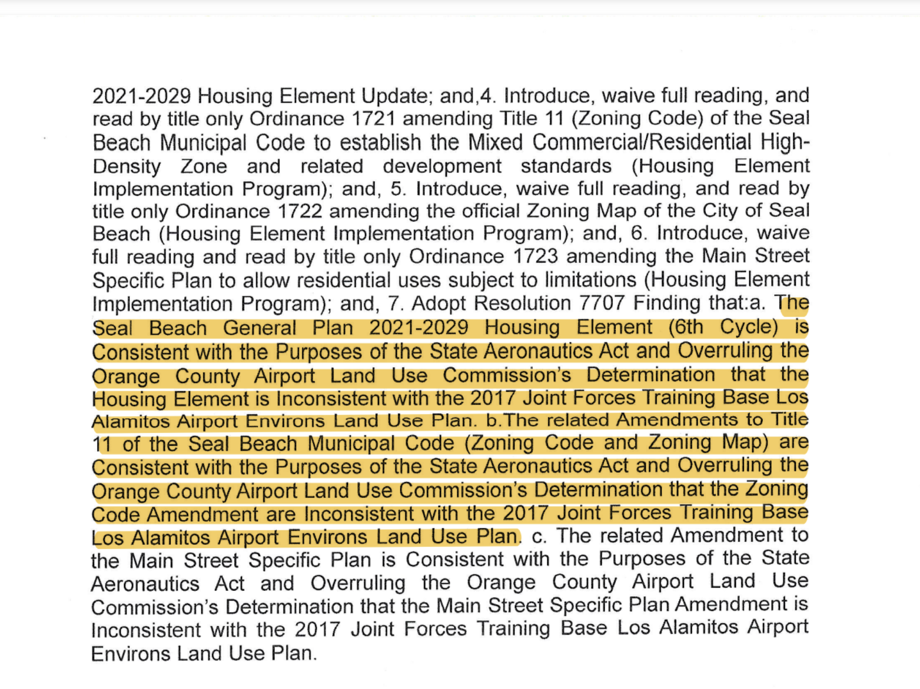 09/14/2025 City Council to consider override of ALUC - From SUN newspapers - "County airport commission finds Housing Element inconsistent with JFTB land use - The Seal Beach City Council on Monday, Sept. 8, 2025, voted unanimously to formally make notice of the council’s intent to override the OC Airport Land Use Commission. This was the last item on the agenda of a nearly three-hour meeting.