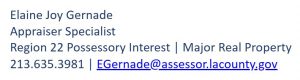 Elaine Joy Gernade - Appraiser Specialist - Region 22 Possessory Interest | Major Real Property - 213.635.3981 |- EGernade@assessor.lacounty.gov