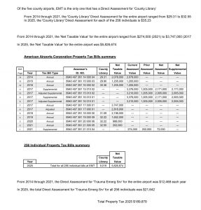 02/22/2026 ASSESSED TAX VALUES at EMT - "Take a look at table 2, right hand two columns. Note taxable assessed value when AAC managed the airports, and the sharp increase when tenants were assessed individually in 2025. Same method of assessment, the “Income Method”. - The following are the assessed values for 2014 and 2025: