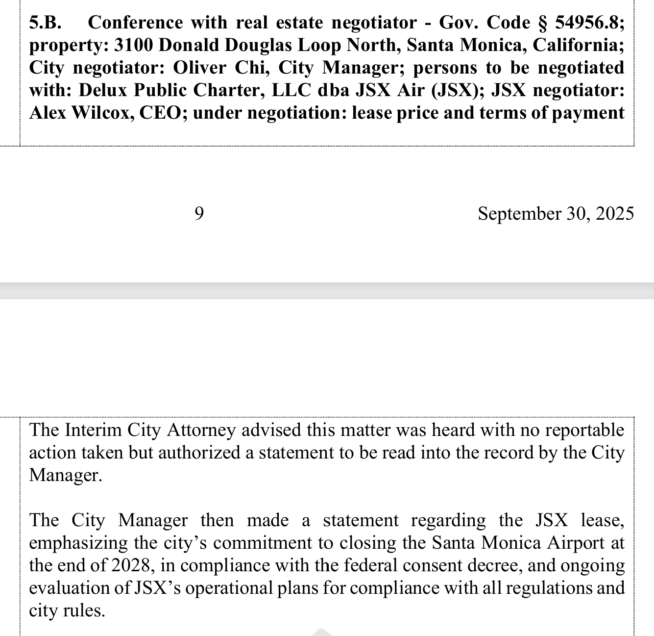 09/28/2025 City of Santa Monica Confirms Airport Closure by Dec. 31, 2028, Amid JSX Permit Review - From Santa Monica Mirror - "City Officials Emphasize Commitment to Long-Term Closure While Considering JSX Proposal