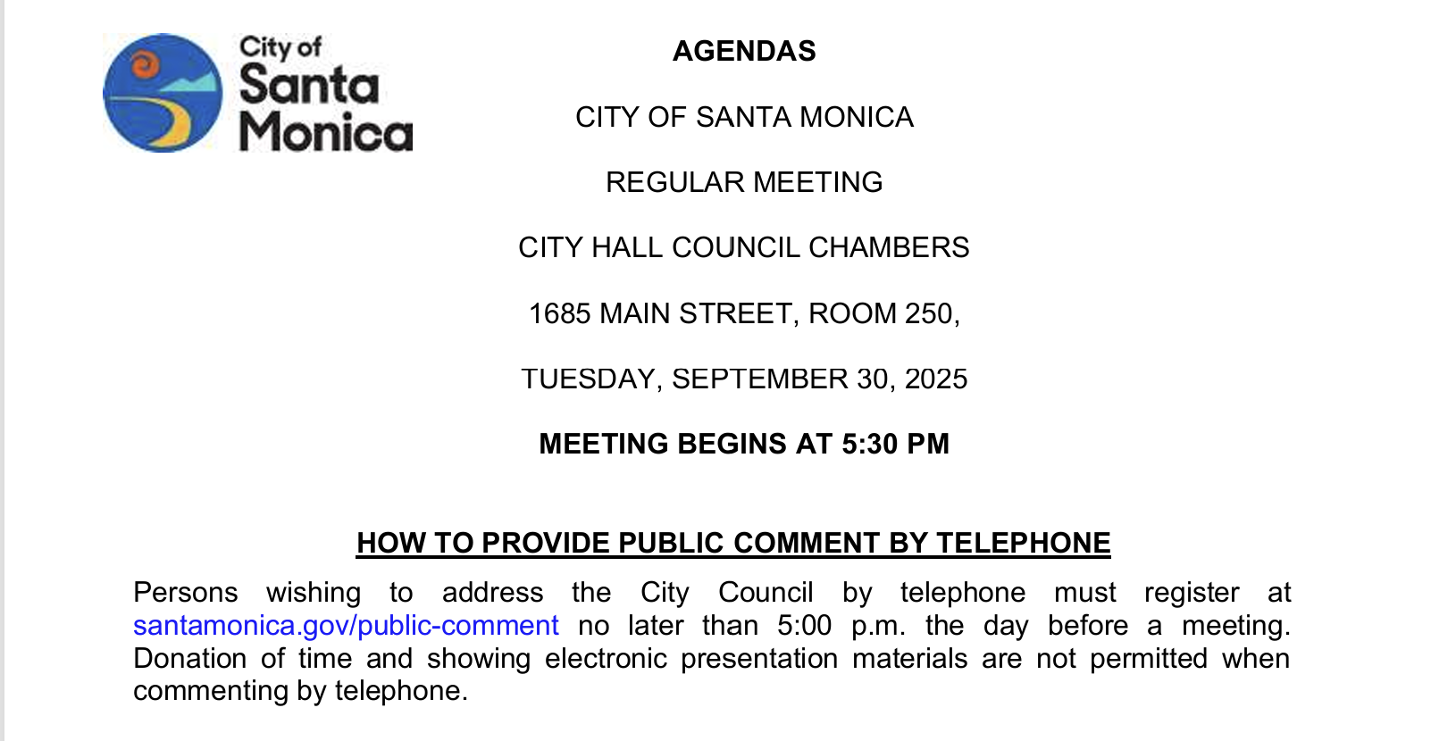 10/19/2025 From the office of the Santa Monica City Clerk - Santa Monica City Council Agendas and Meeting Minutes: You can visit the page HERE. Meeting Portal - City of Santa Monica, California - This web portal is for City Council agendas, staff reports and minutes from 2015 to current.