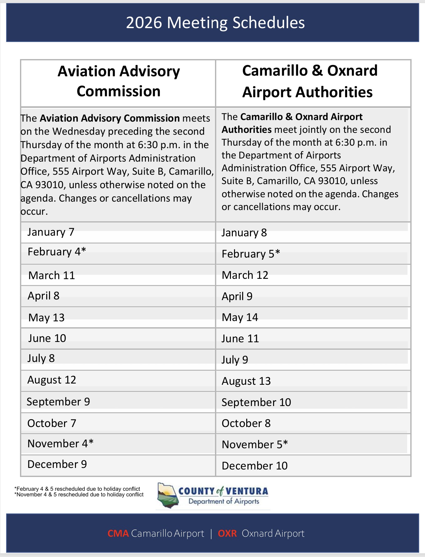 10/29/2025 The Ventura County Department of Airports remains committed to connecting with all stakeholders of both Camarillo and Oxnard Airports as we continue to provide a transparent communication system. As part of this effort, we’d like to remind the community that we have a variety of methods to connect with us, including those listed below: