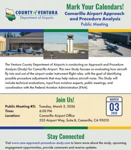 10/16/2025 Thank you to all who joined us at the first public meeting for the Approach and Procedure Analysis (Study) for Camarillo Airport. At the meeting, the project team shared an overview of the Study and presented three new flight procedure adjustments under consideration that may help reduce aircraft noise. We appreciated the opportunity to answer questions and listen to your valuable feedback.
