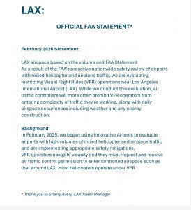 After The Accident at Reagan International Airport LAX made the immediate precautionary steps and proposed restricting Helicopter Routes and canceling the Banner Tow route offshore from the LAX Coast. The Mini Route (VFR Transition Route) also was openly stated as available when staffing permitted only. LAX Tower Management addressed all Regan International Airport parallel issues with a pro-active strategy right away! Sherry Avery, Tower Manager is to be complimented.