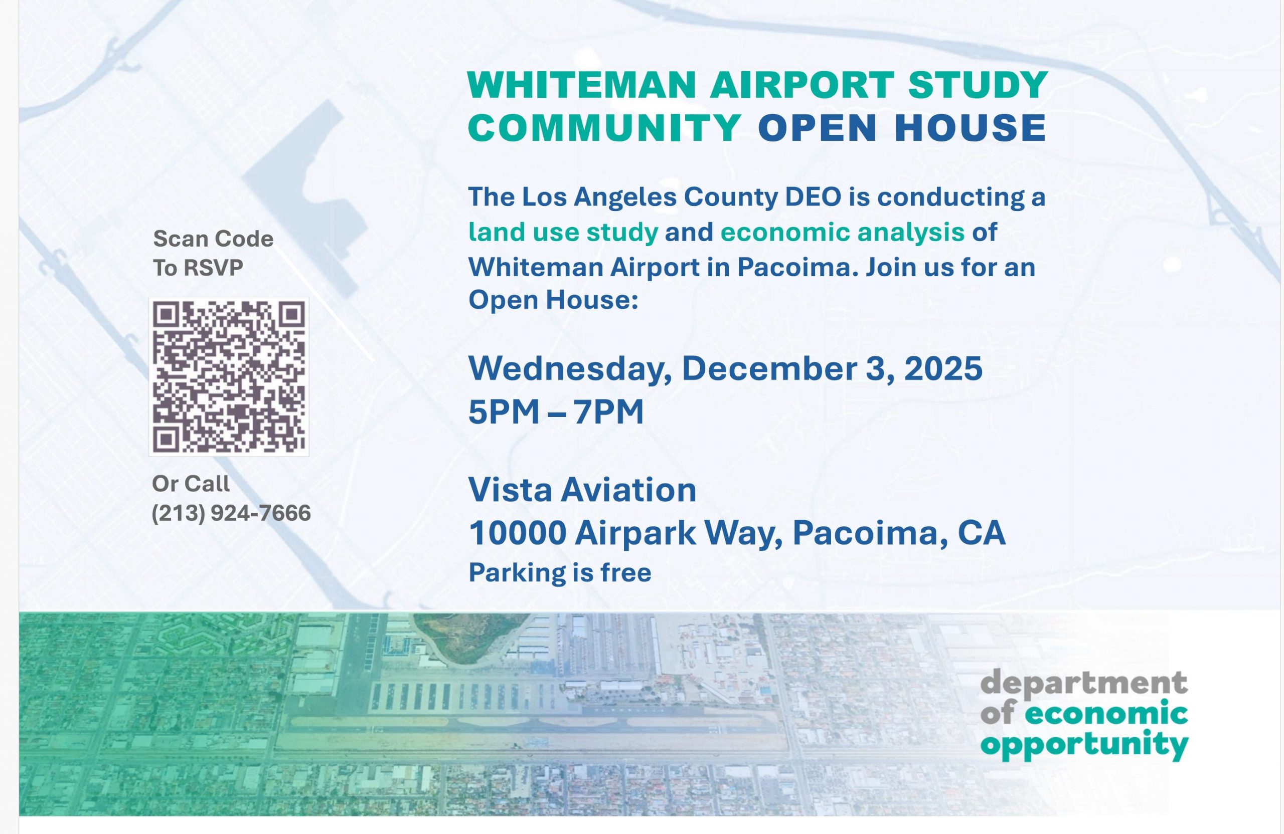 The Los Angeles County Department of Economic Opportunity is conducting a land use study and economic analysis of Whiteman Airport in Pacoima. This study will evaluate the land use options for Whiteman Airport, which includes keeping the airport open, closing the airport in full, or in part, as well as outlining the airport closure process that would be required by the Federal Aviation Administration (FAA).