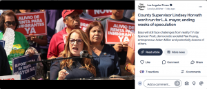 02/01/2026 From CityWatch 01/08/2026 - Misguided Venture Reveals Supervisor Horvath’s Dark Side - "When Lindsey Horvath ran for the Los Angeles County Board of Supervisors in 2022, she sold herself as a fresh voice. She prevailed at the ballot box, buoyed by a Los Angeles Times’ endorsement that crowned her as the “golden ticket” to a new and brighter political world. - But Horvath, a 43-year-old Ohio native who cut her political teeth in West Hollywood, has not proved to be such a fresh voice after all as she seeks reelection this year to the Board of Supervisors, one of California’s most powerful and least scrutinized elected bodies. - Horvath’s flip-side as just another slippery Old School politician has been on display with her conniving, arrogant and dishonest handling of a plan to construct a 167-bed homeless housing project on land donated with a charitable and binding promise, aka the Bandini-Jones covenant, that the land be used exclusively for veterans. - The Bandini-Jones covenant is named after two philanthropists who donated hundreds of acres in 1888 to an arm of the federal government with the condition that the donated land, including what is now the West LA VA campus, be used only to benefit veterans." Continue Reading this very detailed article Here